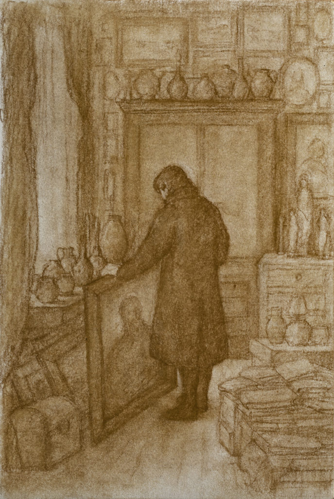 – I en brukthandel i St. Petersburg bruker den fattige maleren Tjartkov sine aller siste penger på et portrett av en bronsefarvet, gammel mann. Bildet er uferdig, men øynene er malt med pinlig nøyaktighet og borrer seg inn i den unge mannens sjel så han grøsser innvendig, skriver Bork S. Nerdrum om Gogols novelle Portrettet. Illustrasjon av Sebastian Salvo.