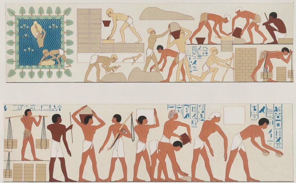 Det mest ikoniske bildet av dette arbeidet er derimot bevart i Rekhmires grav i Thebe, datert til omkring 1450 f.Kr. Der avbildes semittiske og nubiske fanger – «erobrede folk» – når de bærer leire, blander vann, former tegl i former, lar dem tørke og stabler dem i nærvær av egyptiske overordnede bevæpnet med staver.