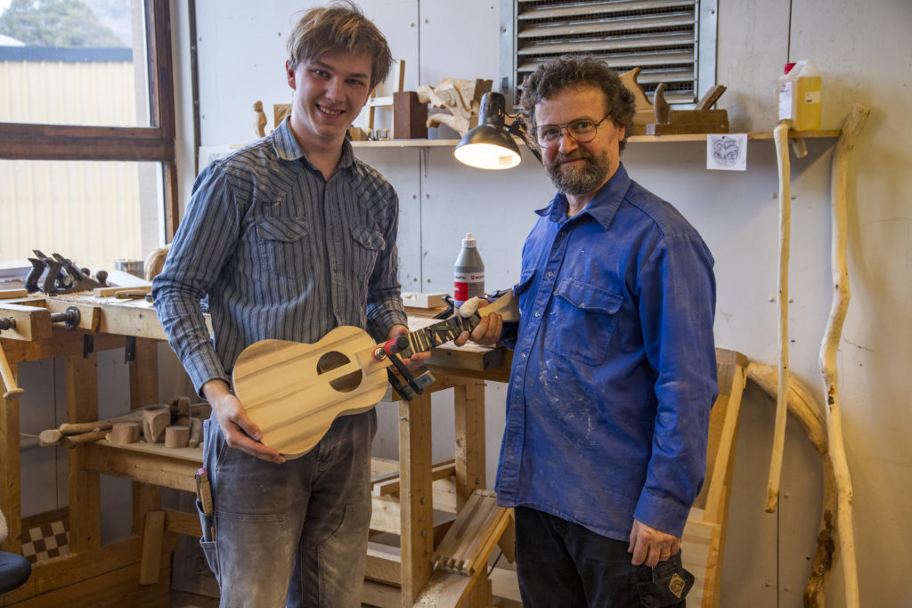 Håkon Bjo Reinås (t.v.) holder det som skal bli en ukulele, sammen med lærer Peter Pots. Foto: Julie Brundtland