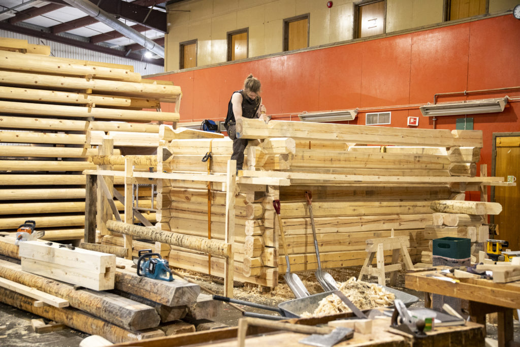 Tre laftehus er under konstruksjon idet vi entrer den store hallen, med høvlebenker og trematerialer så langt øyet kan skue. Det dufter friskt av treverket og både elever og lærere virker optimistiske med tanke på å fullføre de laftede konstruksjonene til fullstendige byggverk.