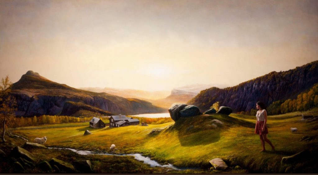 – Hun bringer med seg «lyset» til dalen, verden, når hun kommer tilbake til sitt hjem. Hun går ned til gården, og midt i bildet i forgrunnen er det en steinhelle over bekken som inviterer deg inn i bildet. Lyset er varmt, selv om det egentlig er kaldt. Som du ser, er det snø borte på et fjell i bakgrunnen.