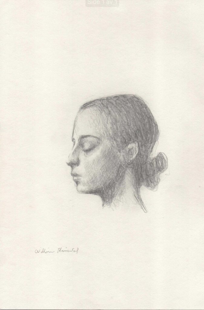 Etter å ha sett gjennom alle tegningene jeg har laget fra 15-årsalderen til i dag, slo det meg at blant alle portrettene ikke en eneste gang hadde tegnet en modell som ser rett på meg, sier William Heimdal som er aktuell med den personlige utstillingen «Vorden».