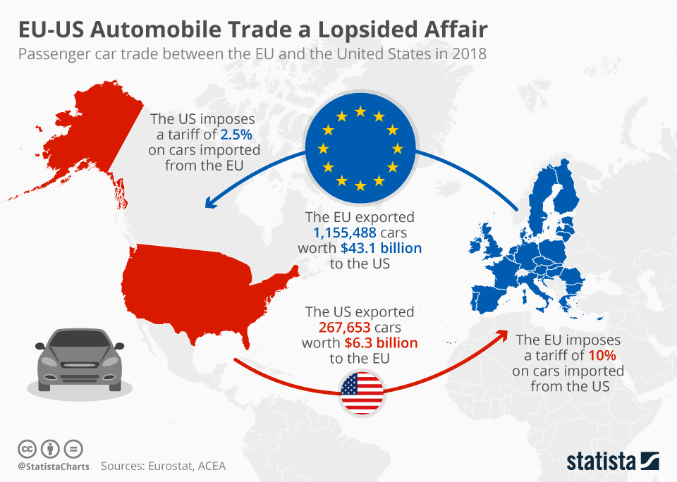 Ta i betraktning de amerikanske bilselskapene: Den amerikanske tollen på biler fra EU har ligget på 2,5 %, mens den europeiske tollen på amerikanske biler har vært 10 %. Det betyr at amerikanske biler står overfor urettferdig konkurranse fra Europa. Det finnes således et rasjonelt holdepunkt for amerikanske mottiltak, i et forsøk på å presse frem mer rettferdig handel.